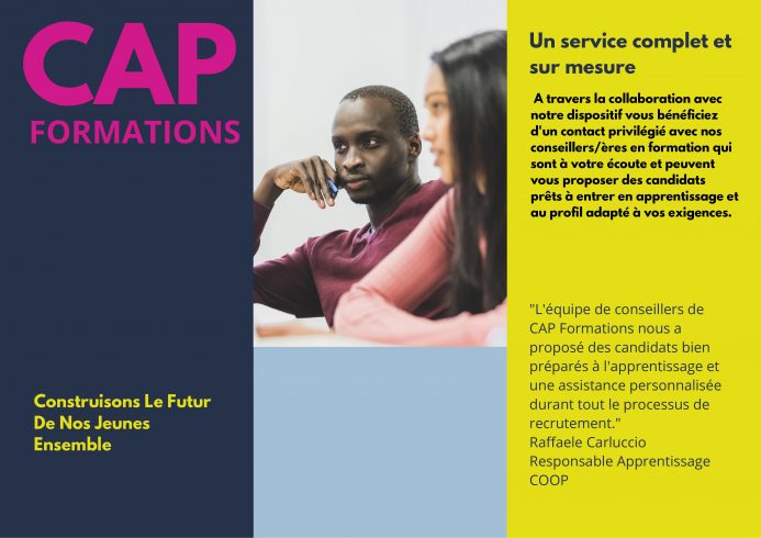 CAP Formations vous propose un service complet sur mesure pour vous aider à trouver l’apprentie ou l’apprenti correspondant à vos besoins. Avec CAP Formations, votre entreprise bénéficie d’un contact privilégié avec nos conseillères et conseillers en formation qui sont à votre écoute et peuvent vous proposer des profils adaptés à vos exigences, prêts à entrer en apprentissage.